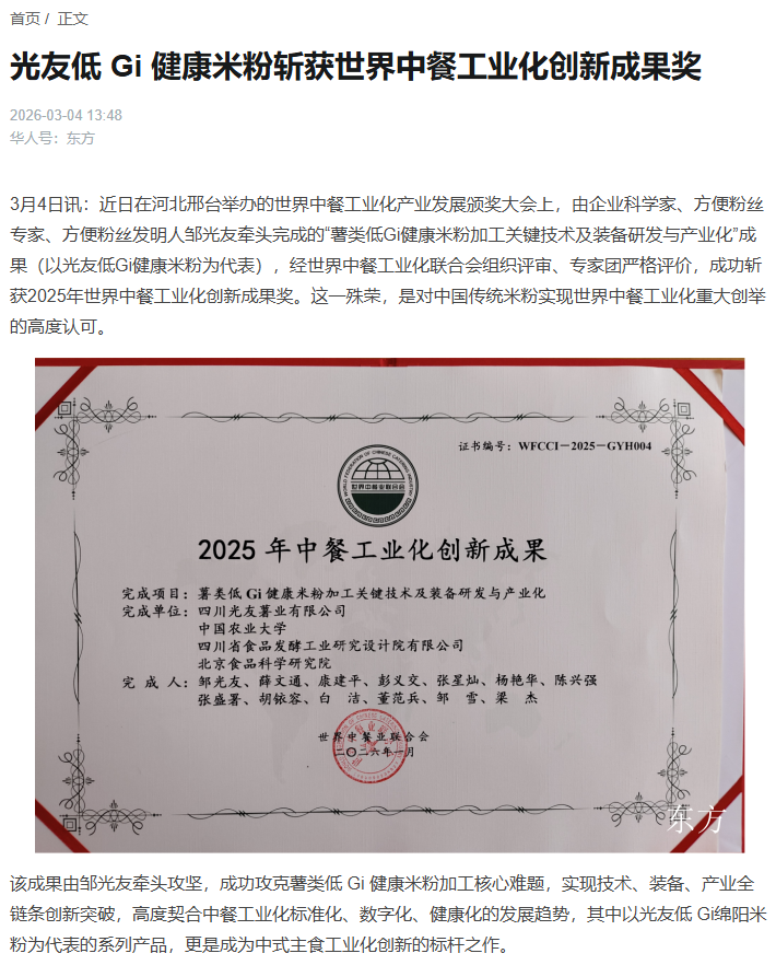 轉(zhuǎn)載華人頭條:光友低 Gi 健康米粉斬獲世界中餐工業(yè)化創(chuàng)新成果獎