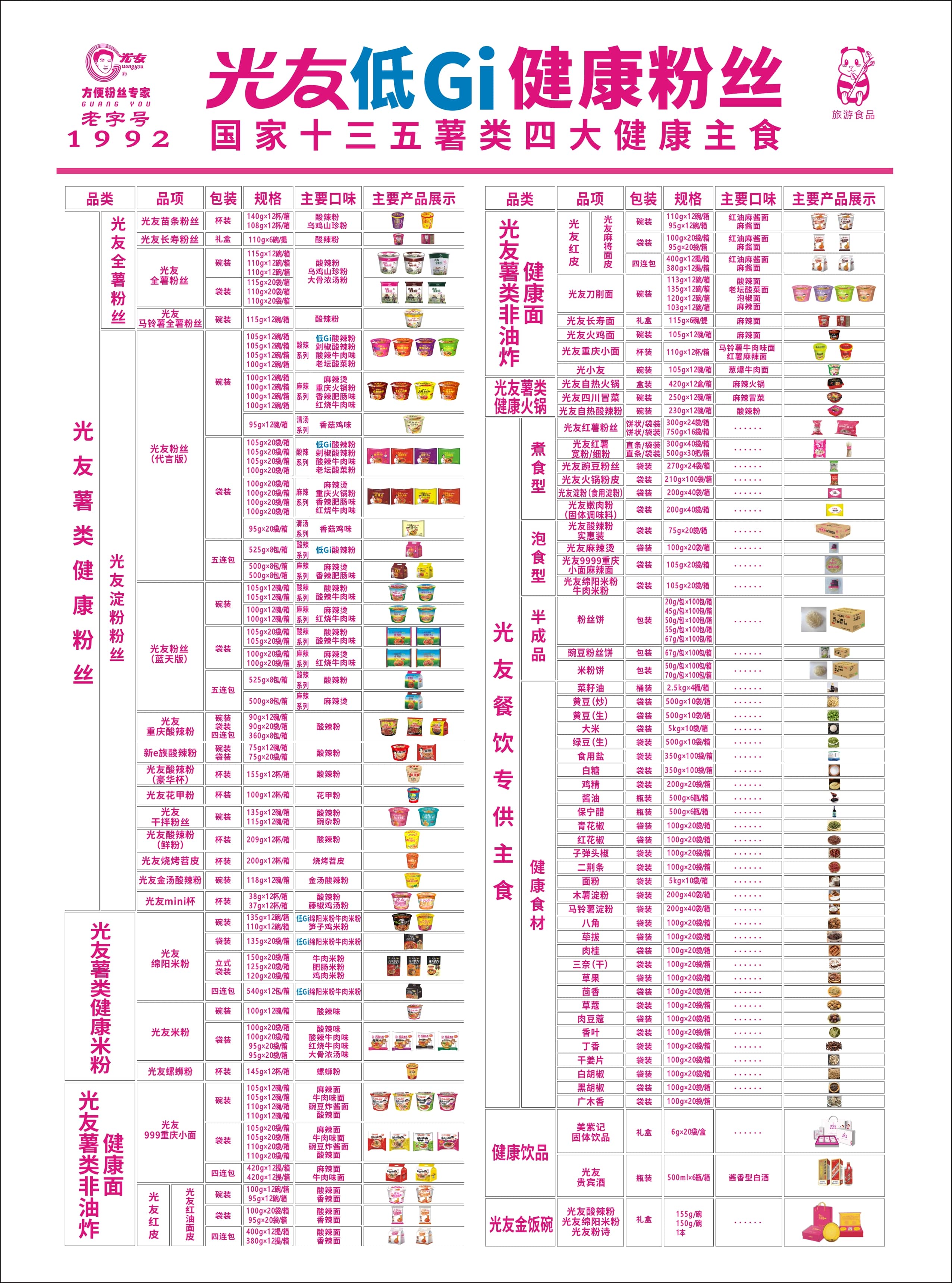光友薯業(yè)創(chuàng)建于1992年10月18日。是一家以薯類深加工為主的健康產(chǎn)業(yè)型、科技產(chǎn)業(yè)型民營企業(yè),以紅薯、紫薯、馬鈴薯為主要原料,研發(fā)、加工、銷售薯類方便粉絲、煮食粉絲、非油炸薯類方便面等健康美味方便主食。